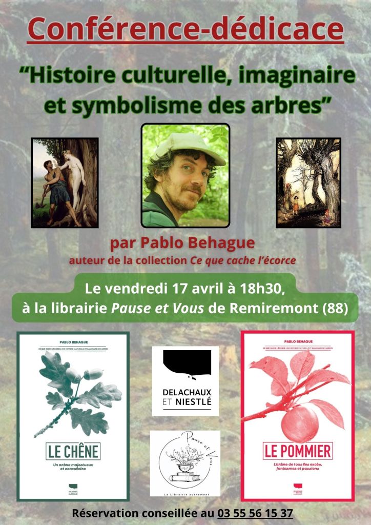 Je vous parlerai de l’imaginaire des arbres à travers les âges, depuis les mythologies anciennes jusqu’à la culture contemporaine, ce qui sera aussi l’occasion pour moi de vous présenter mes livres consacrés au chêne et au pommier, tout juste parus aux éditions Delachaux et Niestlé (sorties en librairie le 3 avril) !