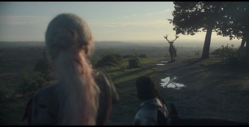 It is interesting to note that the figure of the white stag crosses the centuries, and is found in contemporary works that are familiar to us. Often, it appears to the protagonists in the context of a hunt, which underlines the persistence of the same motif from Celtic Antiquity to the present day. However, those who are lucky enough to cross its path are not necessarily inveterate hunters, but rather singular, gentle beings, whose temperament contrasts precisely with the noise and fury of the hunt. For example, in House of the Dragon, which is a series focusing on the reign of the Targaryens more than 150 years before the birth of the famous Daenerys of Games of Thrones, there is talk of a hunting party organized by King Viserys[ix]. However, this is linked to the rumor that a white stag is found in the surrounding forests. It is then considered that the mammal could be used to decide between the heirs who are fighting over the future throne, namely Rhanyra and her half-brother Aegon. However, when the former finally meets the mythical animal, she simply refuses to harm it. They observe each other for a long time, and this interaction alone convinces her that she is indeed the rightful heir. Here, the stag thus plays its role as « king of the forest »; it chooses the future monarch. However, it also takes on an obvious supernatural character, which the stag’s staging emphasizes in various ways. The young girl is in fact isolated with Sir Criston at the moment of the meeting, while a large crowd is participating in the hunt. Moreover, the scene is calm and silent, and thus contrasts with those that precede and follow, where the din of dogs, shouts and horns resounds from all sides. Finally, it takes place in an open area, with a bright setting, which is distinguished from the dark forest where the men are riding [x].