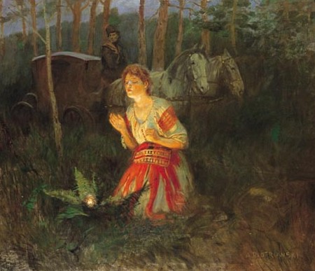 In fact, the fern flower is not perpetually invisible, for then it would simply be impossible to find. On the other hand, it only appears at a specific moment in the calendar, at a well-defined hour in the middle of the night, very briefly, and in a particularly remote and inaccessible place in the forests. One of the main common points in the legends relating to the fern flower is indeed its dated appearance. In the vast majority of cases, the famous night of flowering is that of Midsummer, or immediately before or after; in any case related to the summer solstice. The belief is particularly widespread in the northern and eastern countries of Slavic tradition, where the fern flower is said to develop during a night from June 21 to 24. This is the case in Poland, Estonia, Lithuania, Finland and Latvia. It is therefore linked to the celebrations of the solar cycle, of pre-Christian origins, but which have merged with the festivals of Saint John. In Finland, for example, we speak of the festival of « Juhannus, » or that of « Jani » in Latvia, or « Rasos » in Lithuania. It should be noted that in Poland, the fern flower could be observed not only at the summer solstice, but also at the time of the winter solstice (2). In any case, we understand that it appears on emblematic dates strongly linked to the influence of our luminous star.