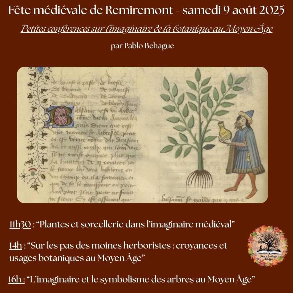 Ce samedi 9 août 2025, je serai à la fête médiévale de Remiremont, où je proposerai trois petites conférences sur l’imaginaire de la botanique au Moyen Âge :