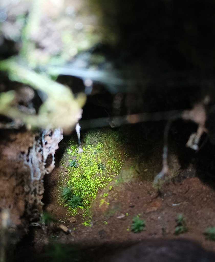 What is interesting about all these stories is that the ephemeral nature of these treasures can echo the reproductive cycle of our luminous moss. The phosphorescent protonema of Schistostega pennata is theoretically observable year-round[xxxiv], but this does not mean that it is perpetually visible at any given site. Thus, we can easily imagine the wonder of a traveler camping in a cave that harbors it, followed by disappointment upon returning months or years later to find nothing dazzling. But beyond the biological cycle of this bryophyte, it is also important to remember that the protonema’s phosphorescence is only perceptible with a specific orientation and intensity of light. In other words, the shimmering effect visible in torchlight disappears when the protonema is moved away from the light source, or when returning in the middle of the day. Furthermore, some Schistostega sites can naturally glow in sunlight at certain times of day, when the sun enters the cave at the right angle. The observer who is lucky enough to be there then sees the goblins’ gold appear… but an ephemeral gold, which disappears in just a few minutes, perhaps inspiring these stories of lost riches.
